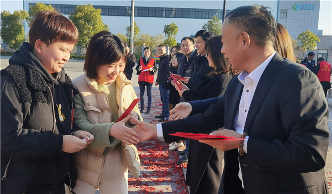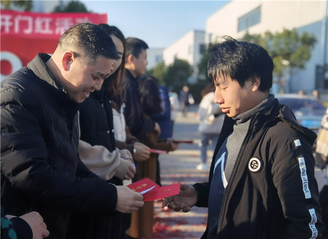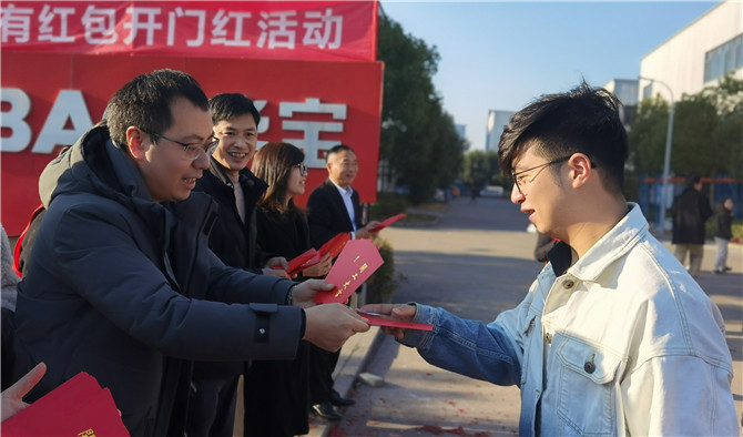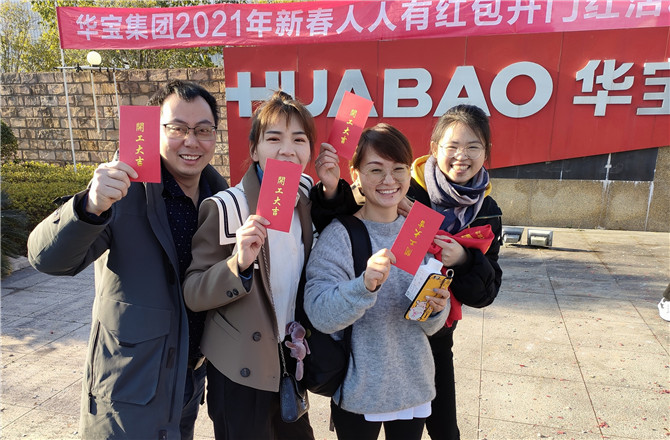 華寶集團為(wei)了(le)迎接和感謝2020年的辛(xin)勤付出及(ji)時(shi)返(fan)崗(gang)的家(jia)人(ren)們(men),開(kai)工當(dang)天,公司中高層領導在公司大門口(kou)為(wei)所有(you)按時(shi)返(fan)崗(gang)的家(jia)人(ren)們(men)準備了(le)開(kai)門紅(hong)包。